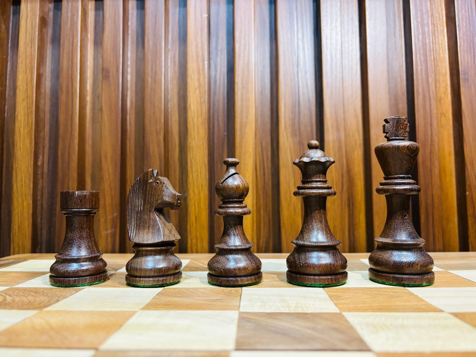 Designed in the classic Staunton style, these pieces offer a timeless appeal with smooth curves, detailed knights, and perfectly balanced weights for steady play. The felted bases ensure smooth movement across the board while protecting the surface from scratches.